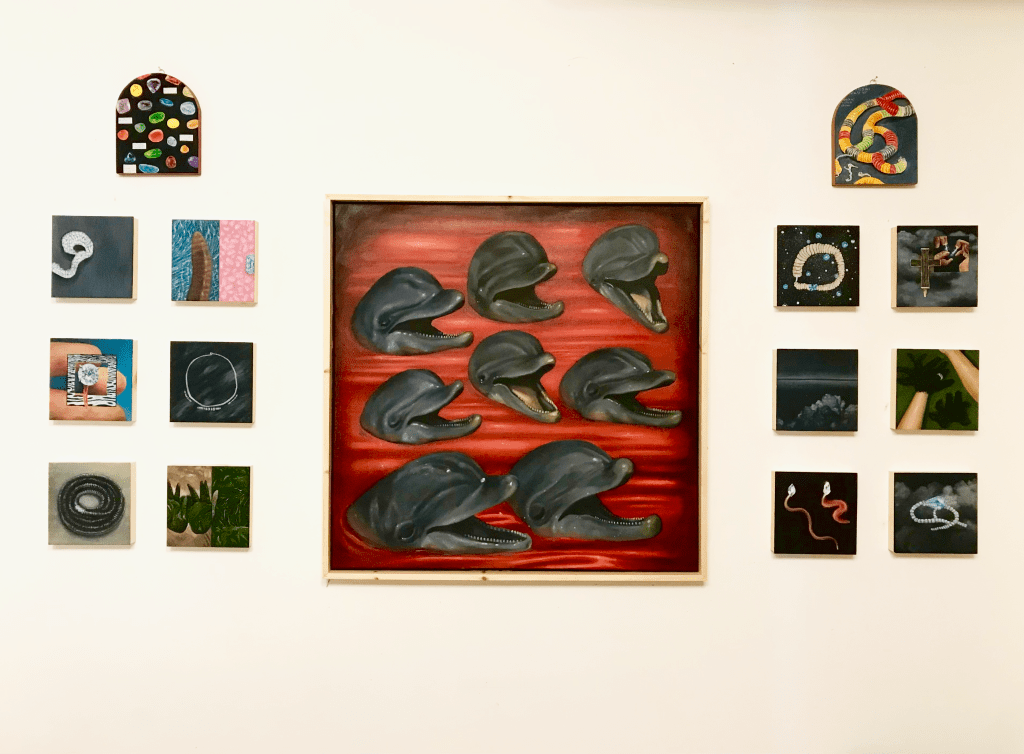 Through these processes the resulting paintings exist as windows into an alternate reality, inspired by contemporary and prehistoric life, filtered through and fed by the internet. The world reflected in flatness and strangeness.