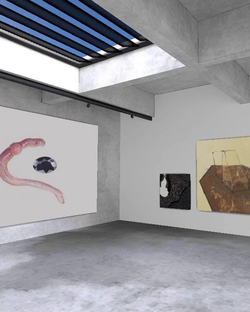 Through these processes the resulting paintings may exist as windows into an alternate reality, inspired by contemporary and prehistoric life, filtered through or fed by the internet. The world reflected in flatness and strangeness.