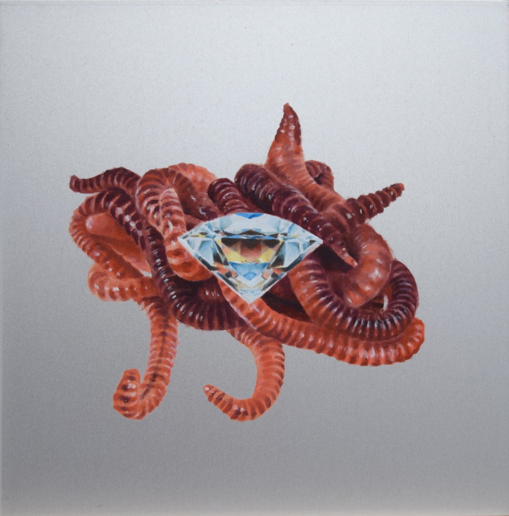 ‘Clew’, the word for a ball of thread, also describes a group of worms. I’m interested in the play between the organic, repulsive forms of the worms against the clean, sharp geometry of the diamond.