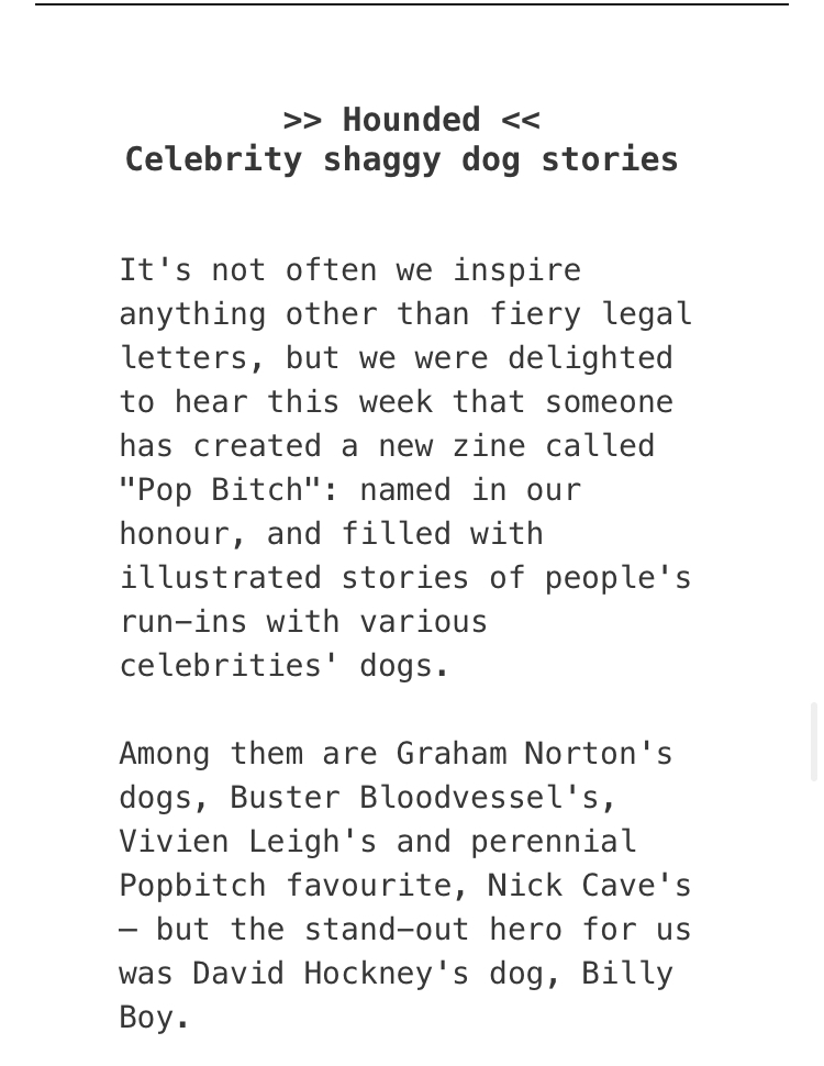 Titled after the infamous celeb gossip email mag ‘popbitch’, the collection comes just from people in my immediate network and has stories about the dogs of people like Nick Cave, David Hockney, Buster Bloodvessel, and classic film star Vivien Leigh.